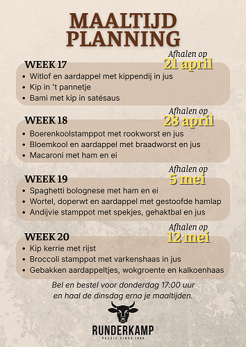 Tot en met donderdag 17.00 uur kun je telefonisch bestellen via 0299-399798. De dinsdag daarna kun je tussen 09.00 - 17.00 uur je 3 maaltijden ophalen en betalen in onze slagerij aan de Burgemeester van Baarstraat 10 in Volendam.