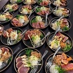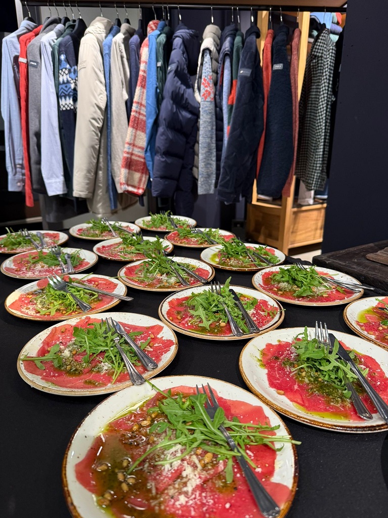 De gasten werden ontvangen met een glaasje bubbels. Vanuit de foodtruck verzorgde hij als eerste gang -of walk om in de modetermen te blijven- een heerlijk malse carpaccio, gevolgd door een mini parkburger van de Caveman BBQ. Tussen de shows door serveerde hij een bordje met plakjes tonijn met wasabi en Japanse mayo en een chicken saté spies. Als toetje toe Tiramisu, welke in het Daiwahouse, het restaurant in het stadion van FC Volendam waar wij elke thuiswedstrijd een 4-gangen diner verzorgen, ook altijd heerlijk in de smaak valt.